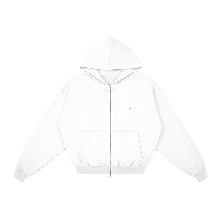 The evolution of our signature silhouette, now with full-zip versatility. This hoodie retains the sculpted volume of the pullover, featuring a tapered hem that anchors the fit at the waist to maintain a strong, "inverted triangle" structure—whether worn open or zipped up. Crafted from 400GSM heavyweight cotton, it functions as a substantial outer layer with a clean, modern profile.